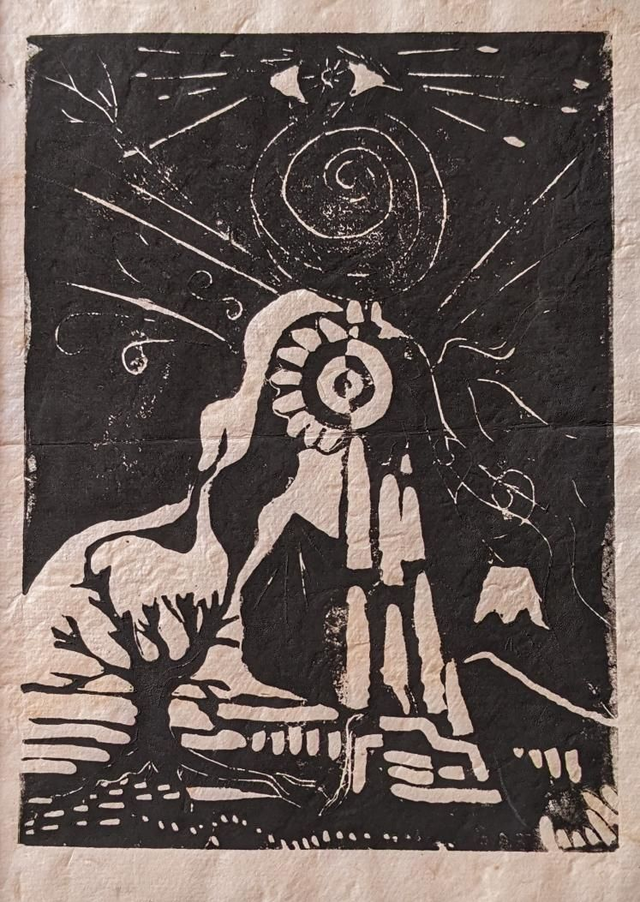 Mounted lino print 'Her Power' by multi-media artist Romy Shiner.